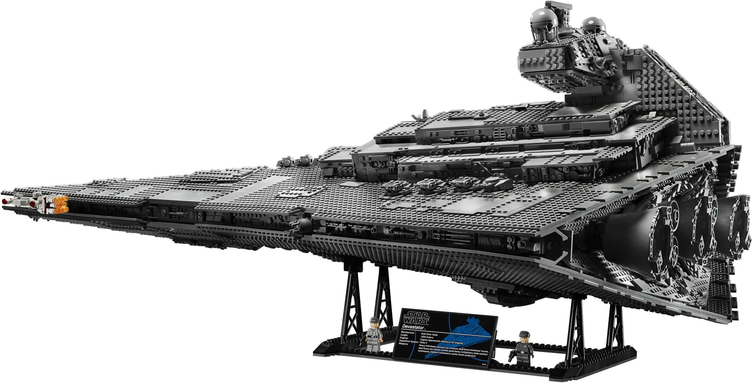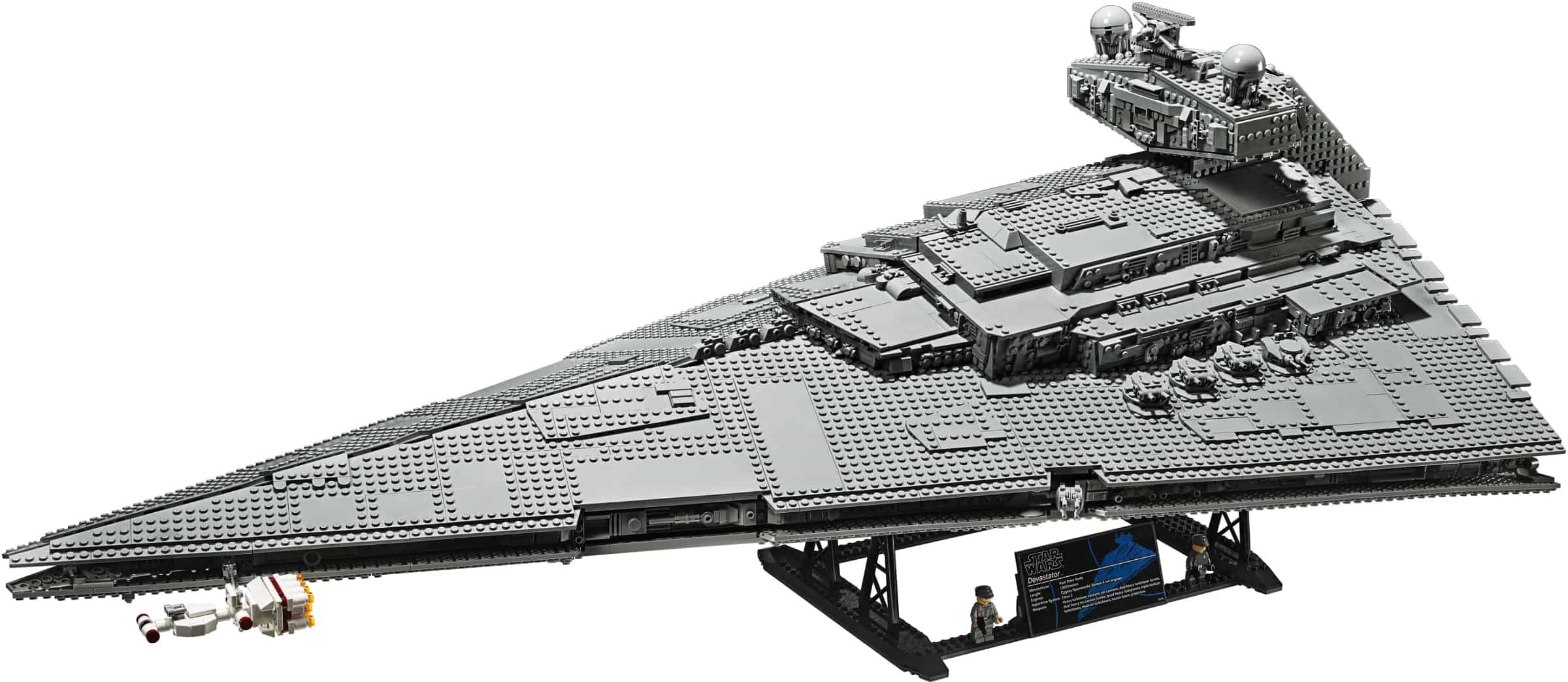 n dit Ultimate Collector Series 75252 Imperial Star Destroyer model met meer dan 4.700 LEGO® elementen zijn alle authentieke details te bewonderen die ook te zien zijn in de openingsscène van Star Wars: A New Hope, zoals draaibare kanonnen, een kantelbare radarschotel, enorme uitlaten, een fraai bewerkt oppervlak en natuurlijk een bouwbare modelversie van het rebellenruimteschip Tantive IV om te achtervolgen.