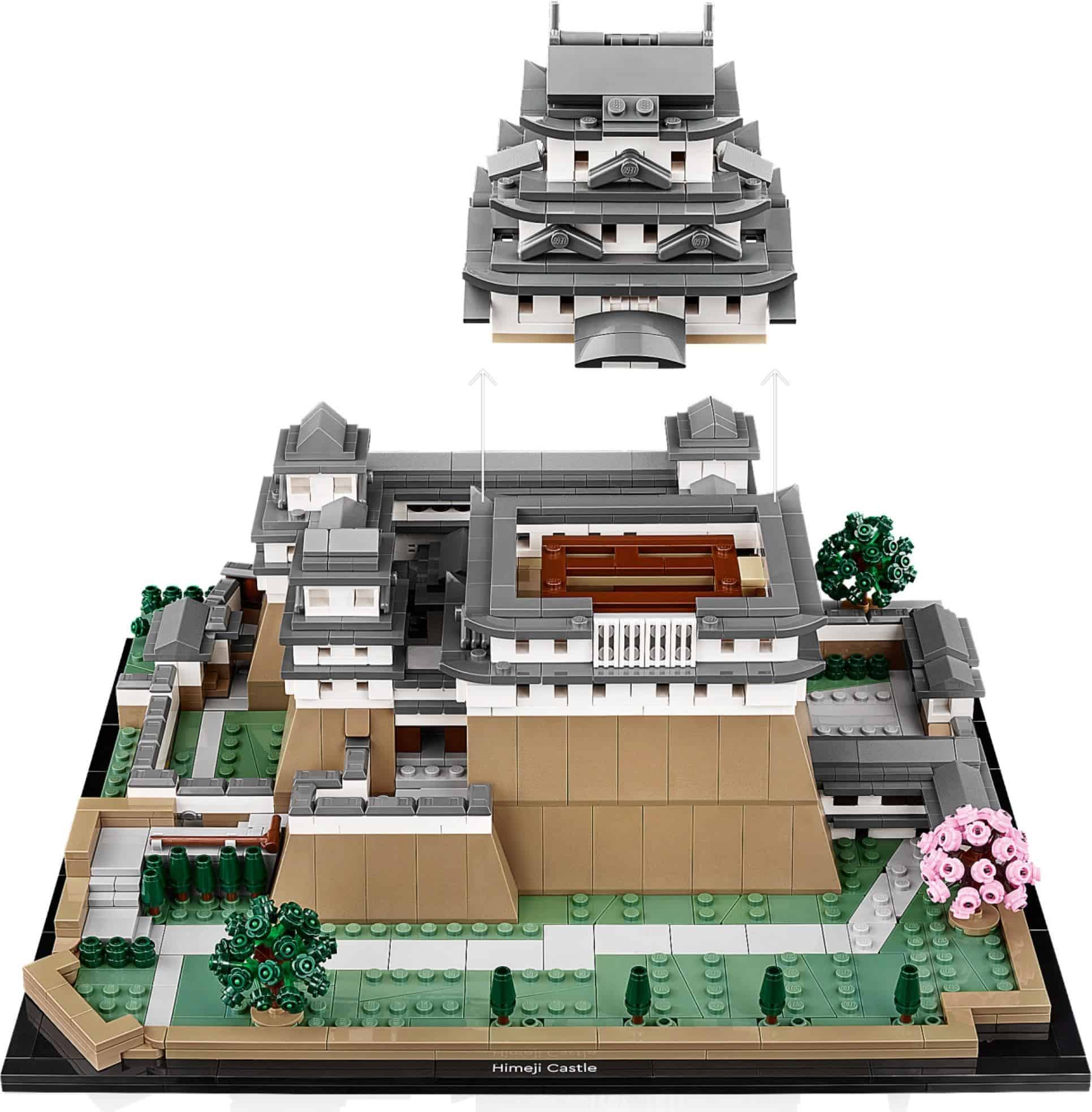 Huur de set bij Blokjes te Huur en reis naar de stad Himeji zonder je huis te verlaten terwijl je authentieke details namaakt, zoals de torens van het kasteel, looppaden en asymmetrische muren in LEGO stijl.